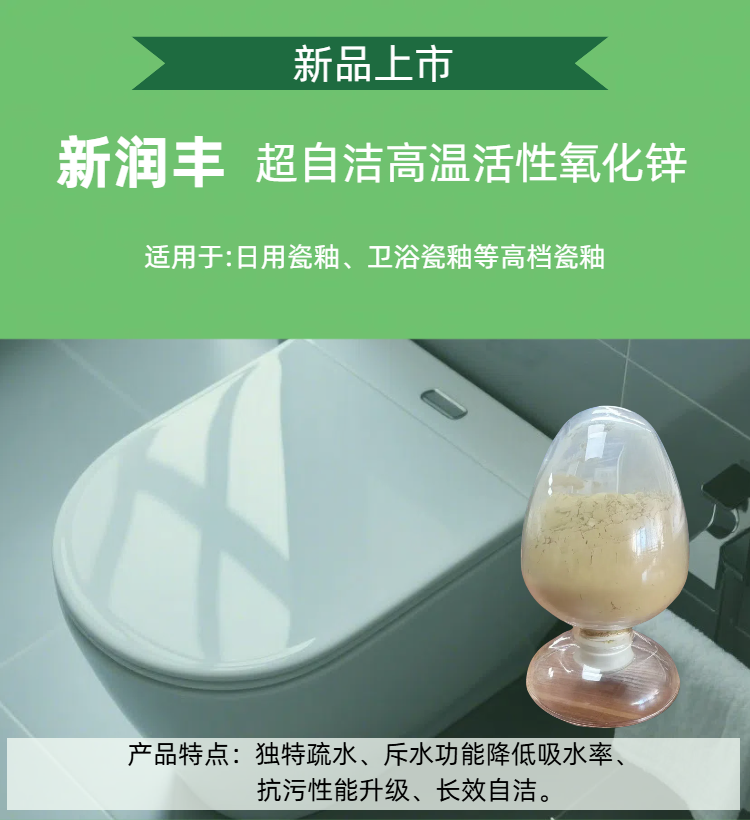 新潤豐超自潔活性氧化鋅系列有超自潔活性氧化鋅、納米易潔氧化鋅·抗菌涂膜兩款產品,用于制造自潔衛(wèi)生陶瓷涂料塑料地板磚等,具有高度的疏水性和疏油性,可以有效地防止污垢的粘附,有效降低產品吸水率,達到特殊自潔效果。