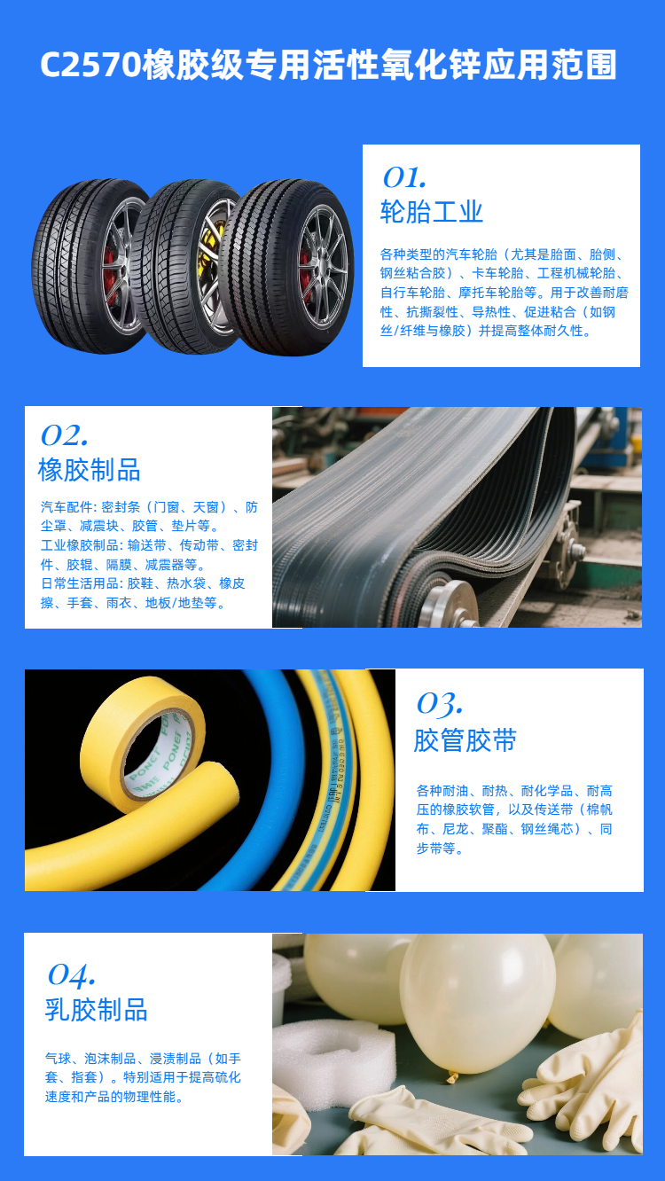 本產(chǎn)品為多功能橡膠助劑,主要作為 硫化活性劑 和 性能增強劑 ,廣泛應用于: