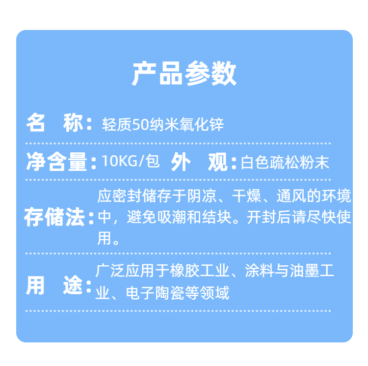 本產(chǎn)品是由肇慶市新潤豐高新材料有限公司采用低溫可控化學(xué)沉淀法制備的高純度納米氧化鋅。其平均一次粒徑嚴格控制在50納米左右,具備典型的六方纖鋅礦晶體結(jié)構(gòu)、較高比表面積及良好的分散性能。產(chǎn)品為白色疏松粉末,廣泛應(yīng)用于橡膠、涂料、電子、陶瓷等領(lǐng)域,作為高性能功能性添加劑,可顯著提升終端產(chǎn)品的力學(xué)性能、抗菌性、紫外屏蔽性和電學(xué)特性。